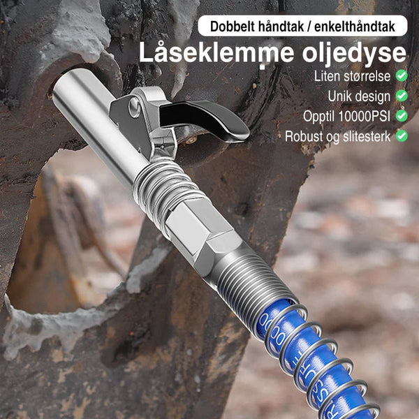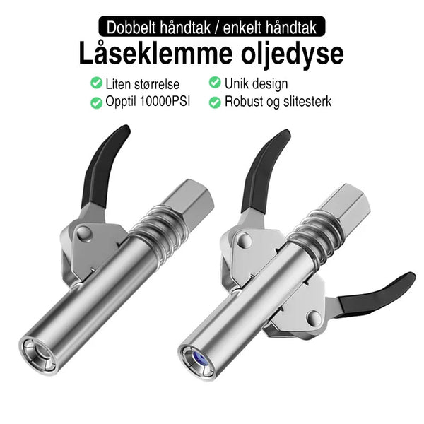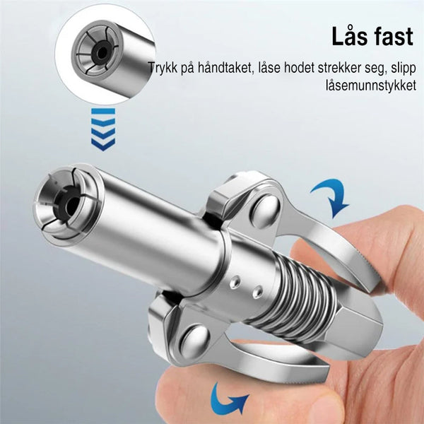【Enhåndsbetjening】 Vår smørepistolkobling er oppgradert til et dobbelthåndtak, som kan betjenes med én hånd og sparer 50 % innsats, ergonomisk. Hjørnene med liten betjeningsplass kan også nås og låses med én hånd.