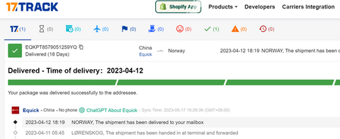 Hvis sporingsnummeret ditt starter med EQK, kan du sette sporingsnummeret direkte inn i 17track for sporing. Se prosessen i bildene nedenfor